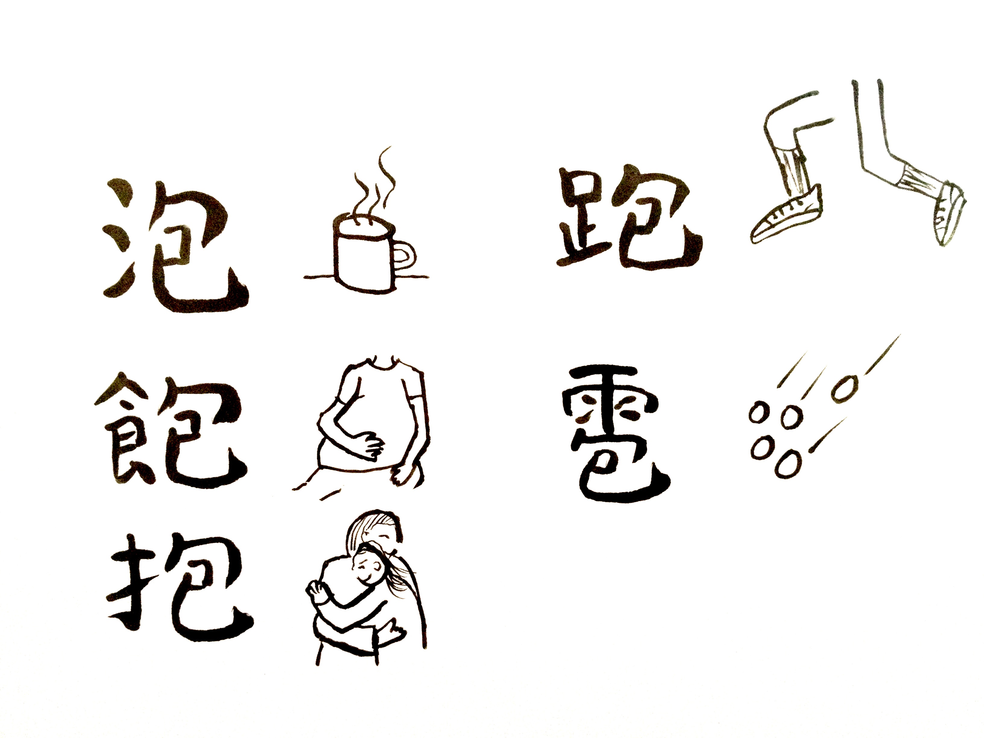 Brewing tea, being full, hugging. Running and hail. Keep your eye on the bao.