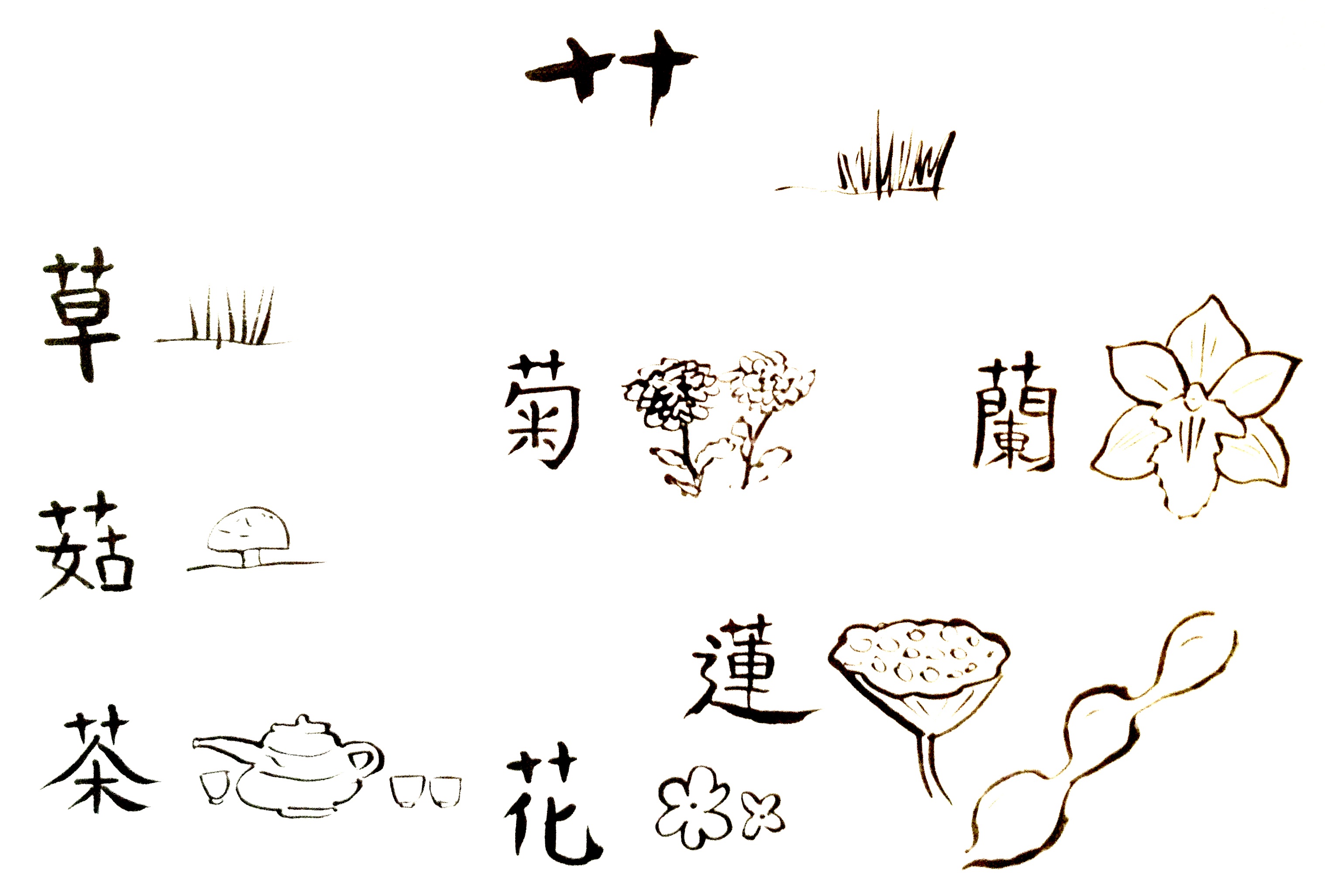 Herbaceous plants (and fungi) are depicted with the two crosses of tsao. Grass, mushroom, tea, and flower are written with ‘tsao’ on top. Chrysanthemum flowers are good for tea; and for making a soup with pig tripe. The orchid is a ‘tsao’ with a doorway looking to the morning sun in the east. Out of the muddy waters of the pond rises the lotus flower. It is the soul beaming in pure light. Where’s that recipe for lotus seeds and winter melon soup? Don’t forget the pig bones. Grandma!?