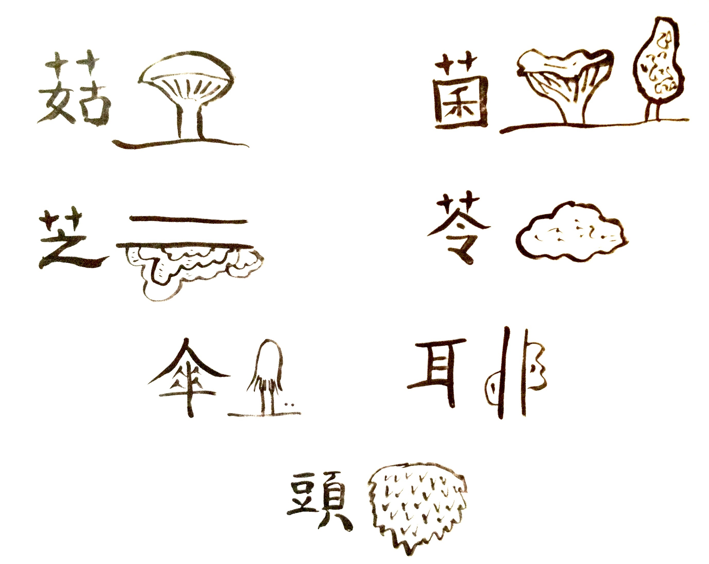 The “typical” mushroom is gu. Hard conk, shelf-like, mushrooms are zhi. Morels and chanterelles are jun. The potato tuber of Poria is qing. Shaggy manes are umbrellas, Tremellas are ears (growing out of a tree), and Hiercium is the head of a furry lion.