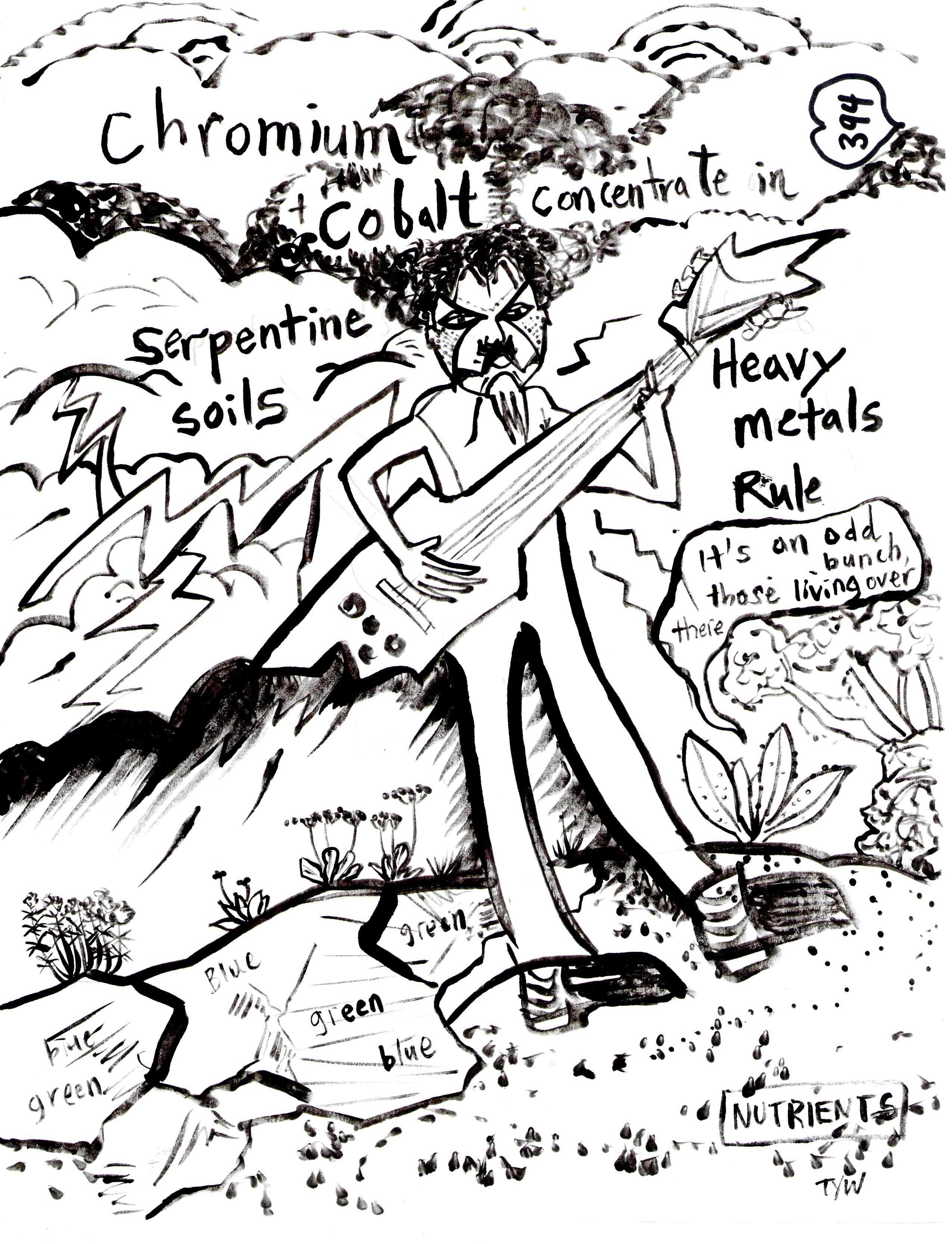 The California state rock is a beautiful blue green rock called Serpentine. A diagonal belt of it runs across San Francisco from the old military base Presidio to the hills of Potrero near Starr King School and some magnificent Mariposa lilies. Serpentine has a high concentration of Chromium and Cobalt – heavy metals. It is also poor in nutrients such as nitrogen, phosphorus, and potassium. It is a difficult substrate for many plants to live in. However, some thrive in it.
