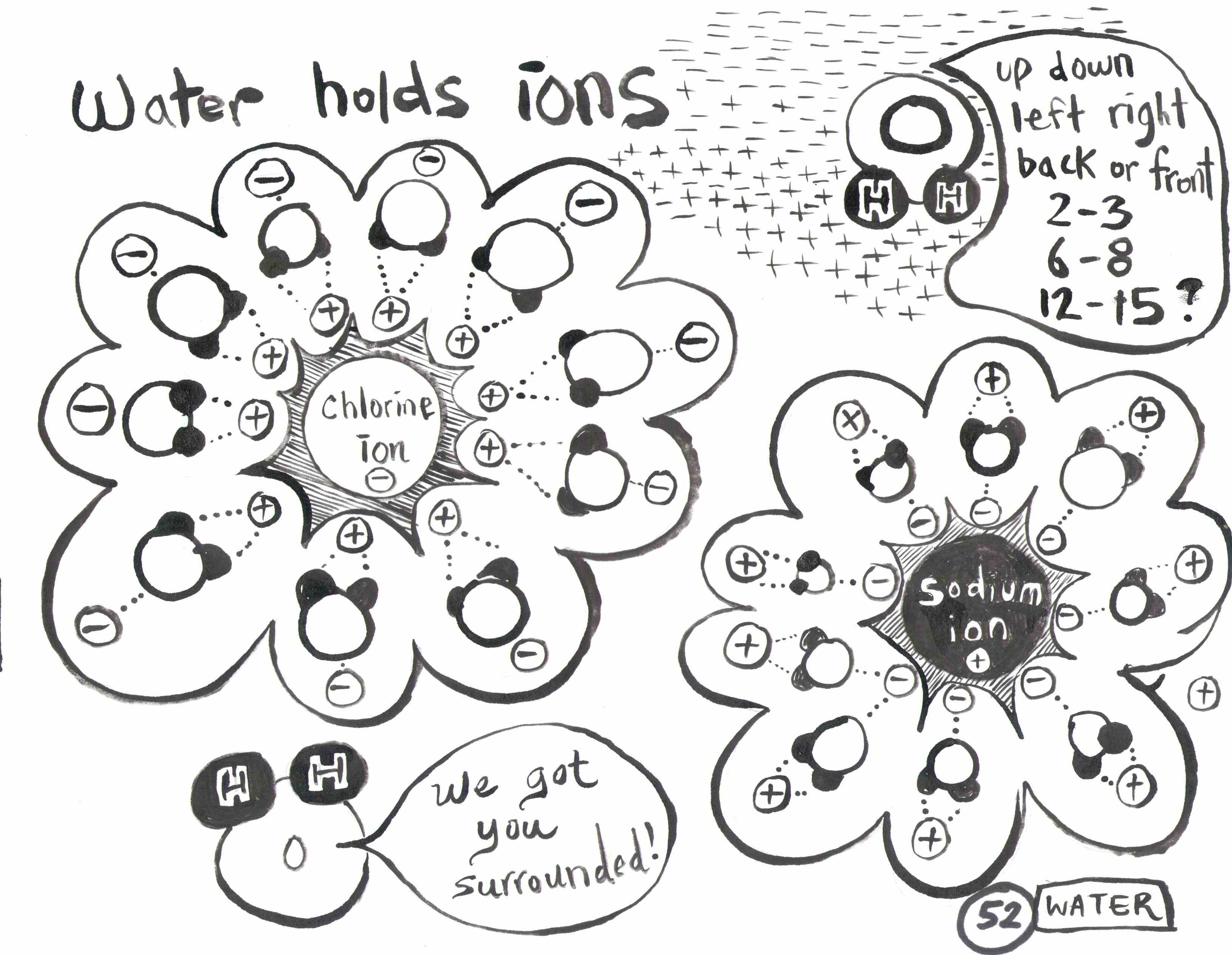 Water is divine stuff. Tons of cool substances dissolves in water. Here’s a picture of water holding ions of sodium and chlorine. So, it doesn’t matter if the ion is charge positive or charge negative. Water has got both sides, and turns around back and forth to make strong secure bonds. The water molecule saying Up down left right back or front 2-3 6-8 12-15? is referring to tides, direction of the wave, front side or backside, and wave heights in feet.