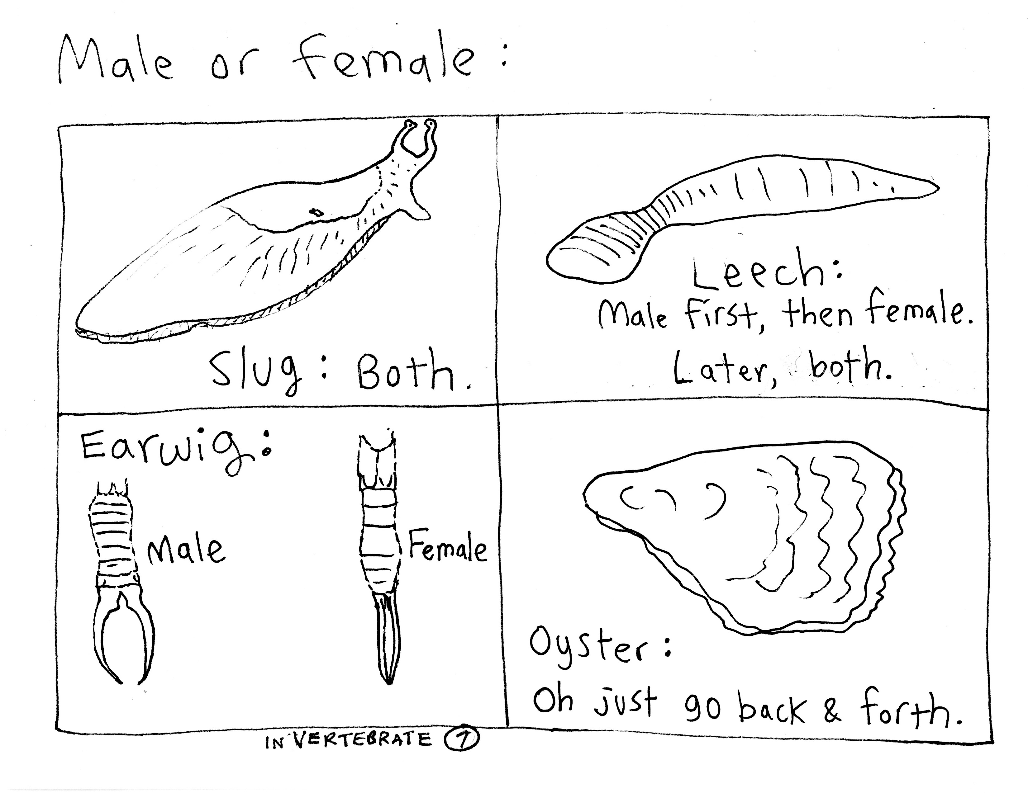 In the insects, males and females are often separate and distinct. They sometimes look very different from one another. In other groups of invertebrates like gastropods, hermaphroditism and sex change is common. Hormones and parts change to best adapt to prevailing conditions.