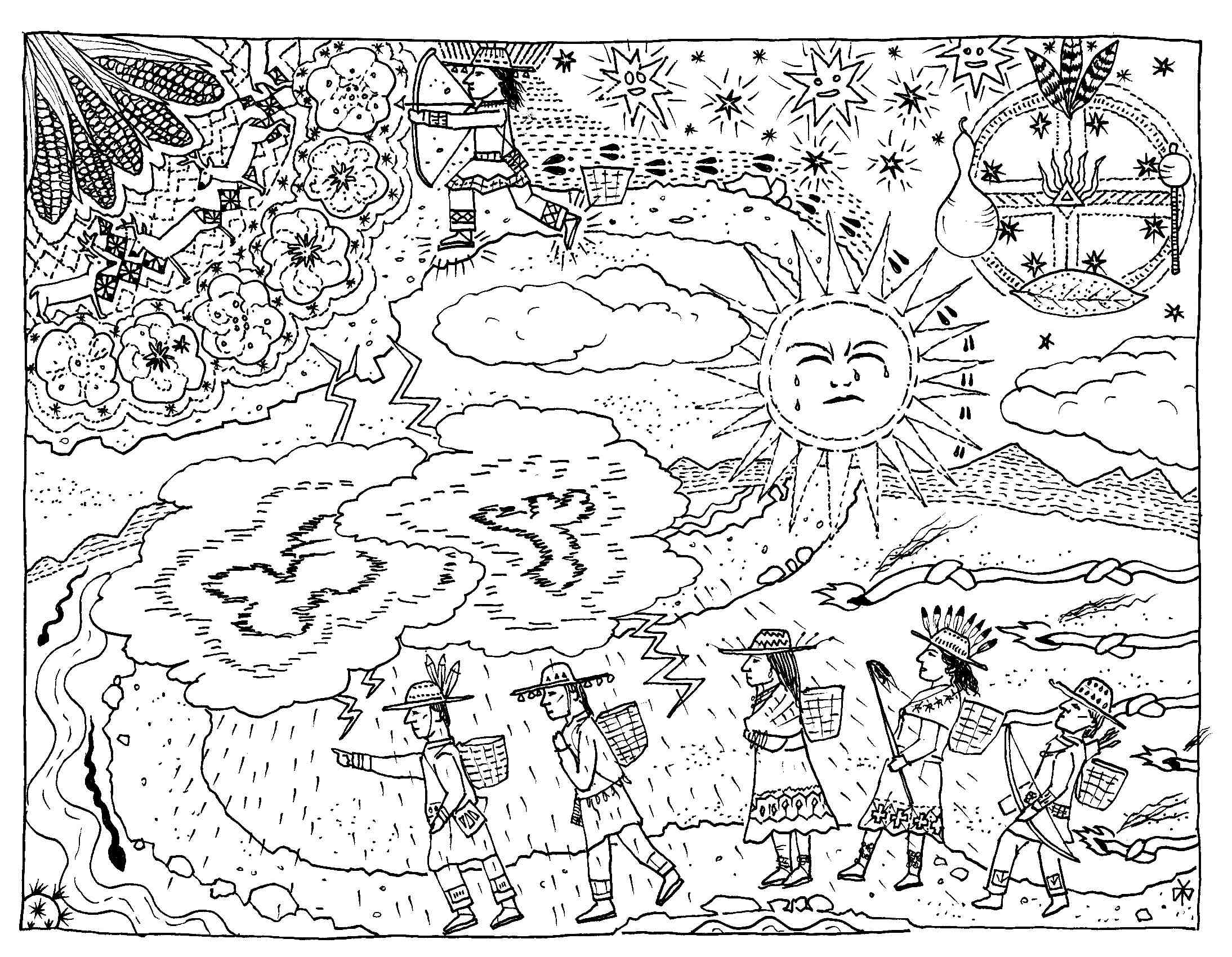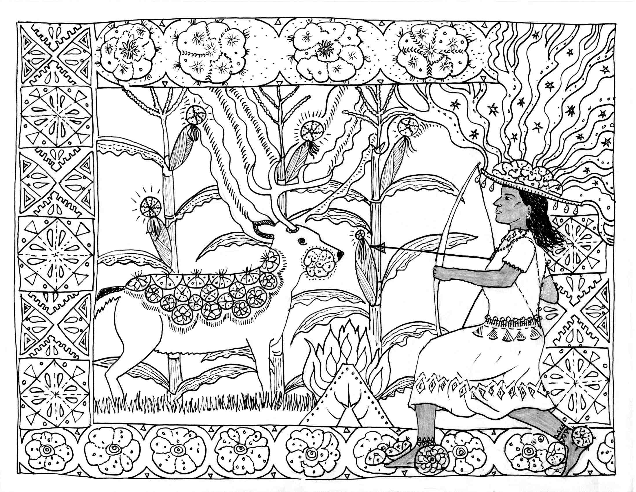 Wirikuta is filled with colors. It is just like I remember it. It is all that is good. All the ancestors reside here. They sit and chat, enjoying each other’s company. Sharing food. Listening to stories. Yellow and Brown. Red, White and Blue. Black and Orange. Green leaves of corn. Long white hairs of grandfather Hikuri. Pink flowers of Tutu. Bear is tumbling with Coyote, messing around. Salmon and his posse are headed out to sea. In the skies, Condor and Eagle are smiling as they play tag with the stars.