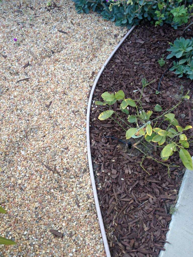 And here? What kind of edging? What might be a potential problem with small round pebbles as a hardscape surface? Do you see the two areas (mulch and pebbles) as staying discrete over time?