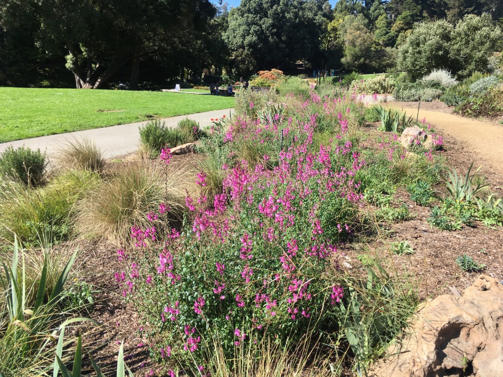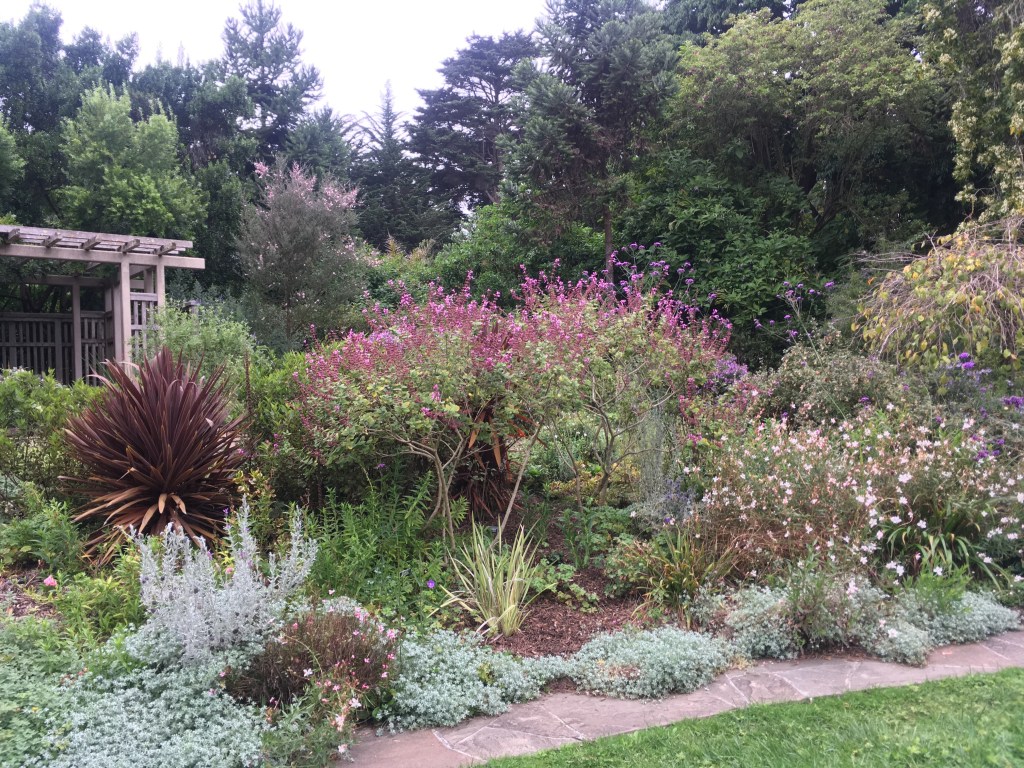 The Zellerbach Garden is a formal garden that is high maintenance. To look good the perennials need a lot of attention. Luckily it has some help from a group of volunteers who have been coming for over thirty years weekly. Deadheading, pruning, weeding, and so on. It is another garden that is not focused on diversity and ecology, its palette is based around the pinks and purples, with a smattering of red white and blue. So it is warmer in temperature and wavelength. There is a little bit of symmetry – the matching structures and trees – but it also has that English perennial border feel of happy exuberance and abundance. Notice how the perennials are for the most part herbaceous, not woody. Hence over time you get nice clumps of blooms, and not huge shrubs trying to take over and shade out everybody else.