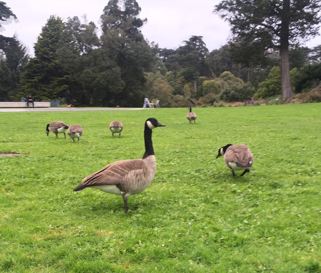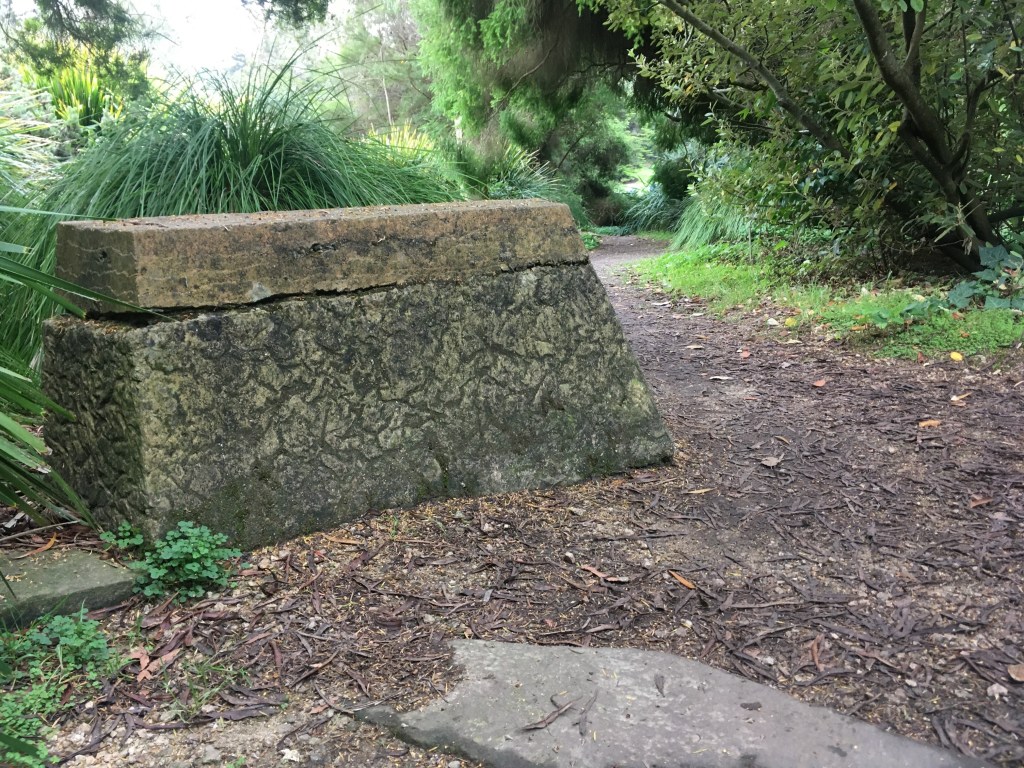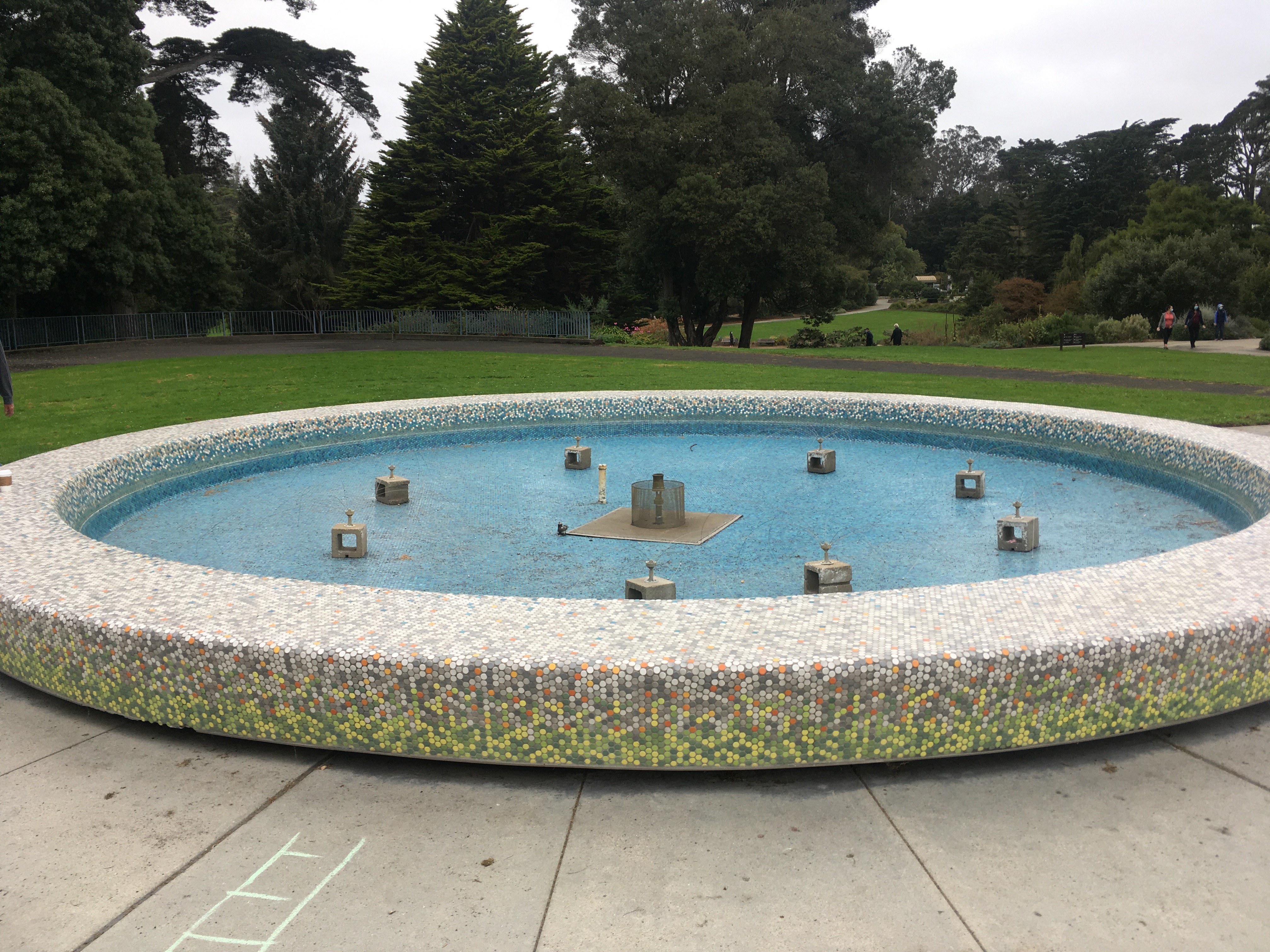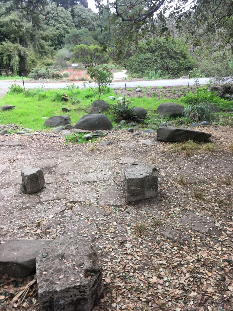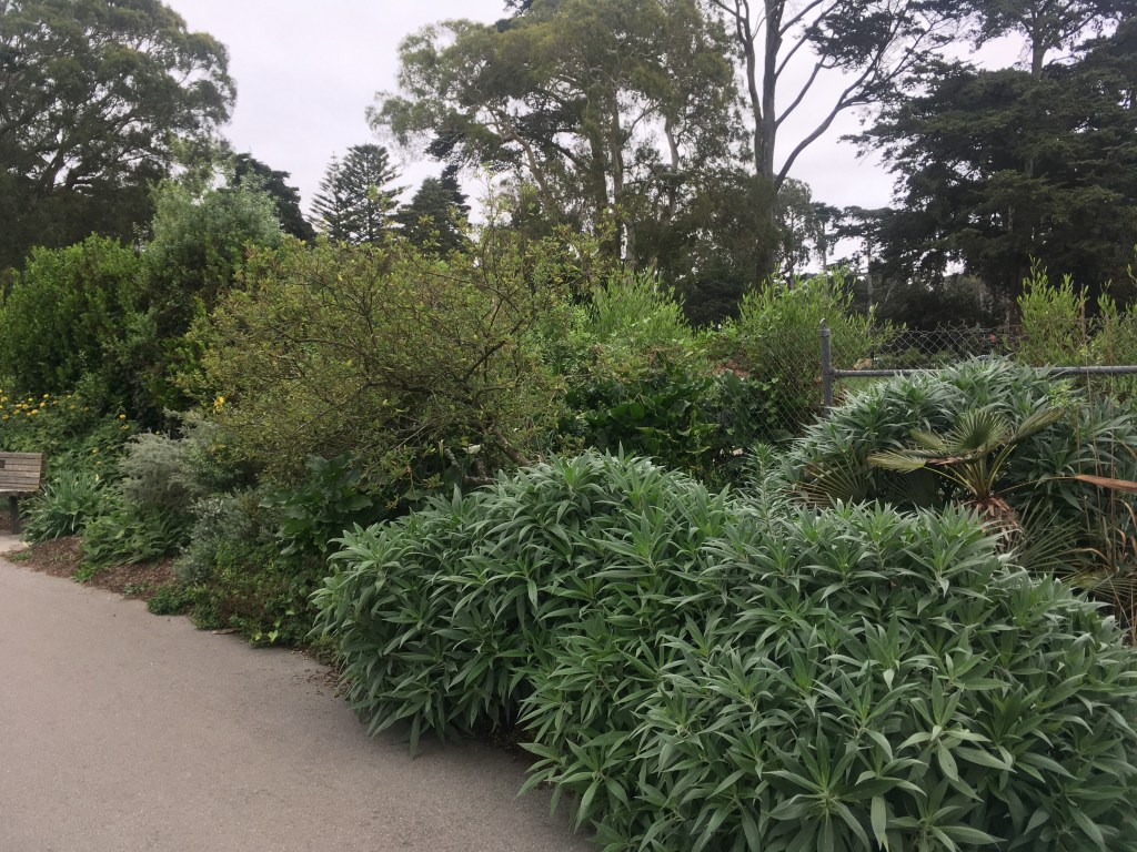 Water is central to a garden. In the old European style it is commonly a fountain in the middle, or in the Moorish style it might run along a trough through the center. San Francisco Botanical Garden is no exception. At the end of the great meadow is this beauty. It is temporarily not running due to construction or repairs. The cinder blocks with the wires on top is a bird deterrent that resembles a daddy long legs spider. It is meant to keep geese and other critters from going in the fountain and pooping there.