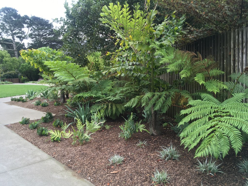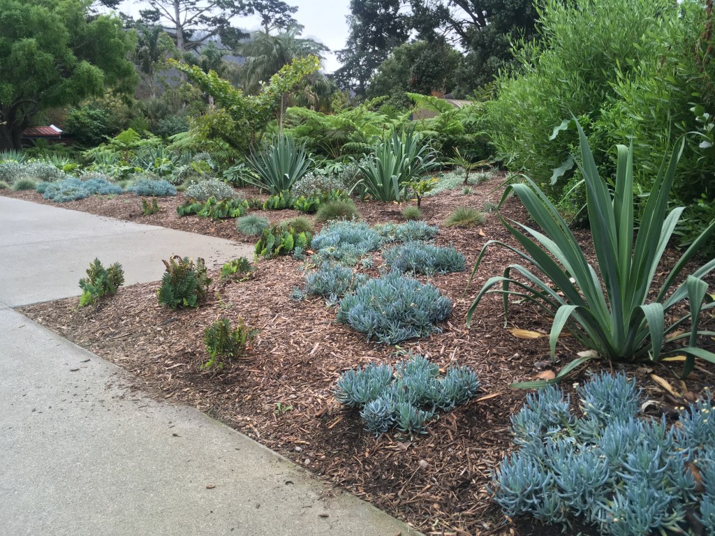 This garden is defined by wide expanses of turf, followed by silvery Convovulus and low spreading silver Dichondra; tree ferns, silver spear Astelia; blue succulent Senecio madraliscae; blue fescue. You get the idea – color is cool, and the plants range from full sun to shade. The most challenging aspect is likely the litter under the tall Eucalyptus trees, the open and windy exposure, the meticulous nature that is crucial to a rental space, and the safety of 2-4 year olds playing near sharp agaves.
