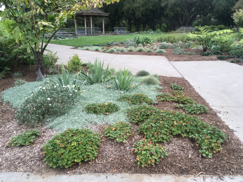 Go in to the new garden that has been designed by Lutsko and Guillou, it is called the Celebration Garden, a garden meant to be used as an outdoor venue for events. It replaced the demonstration garden; the only remnant of the past here is the pavilion designed by Thomas Church. This garden is also planted primarily based on color – whites, silvers, blues, greens. Elevation wise it is mostly flat and low. The tallest plants planted here are the large fishtail palms Caryota. In time, they are to be overtaken deliberately by the wax palms Ceroxylon. In maybe 40 or 50 years according to the staff.