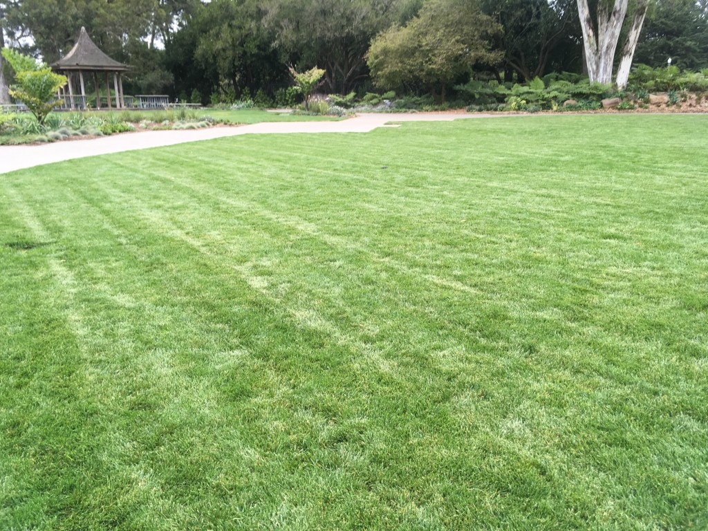 As we traverse the northern edge of the great meadow of lawn, take a look at the planting beds on the right side. The plants are grouped not by geography or rarity or ecology, but by color. All the plants are of the cool blue yellow and white wavelength. In the first picture there is the rhizomatous running grass Leymus condensatus, the yellow feet of kangaroo paws Anigozanthus, yellow flowered Phlomis fruiticosa, and the shrub sticking up is Melaleuca incana the grey honey myrtle. Further on there is blue Ceanothus, gray greenish Echium, and a Griselinia hedge with the variegated yellow borders. All super cooooool.