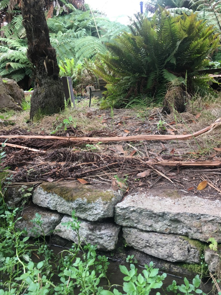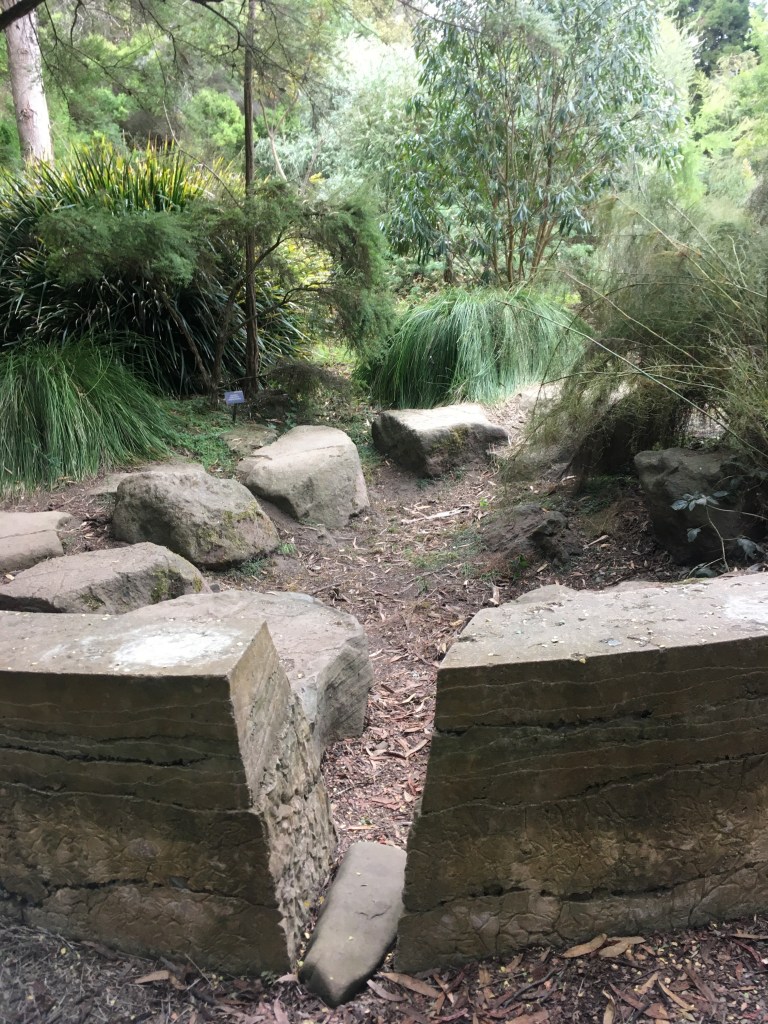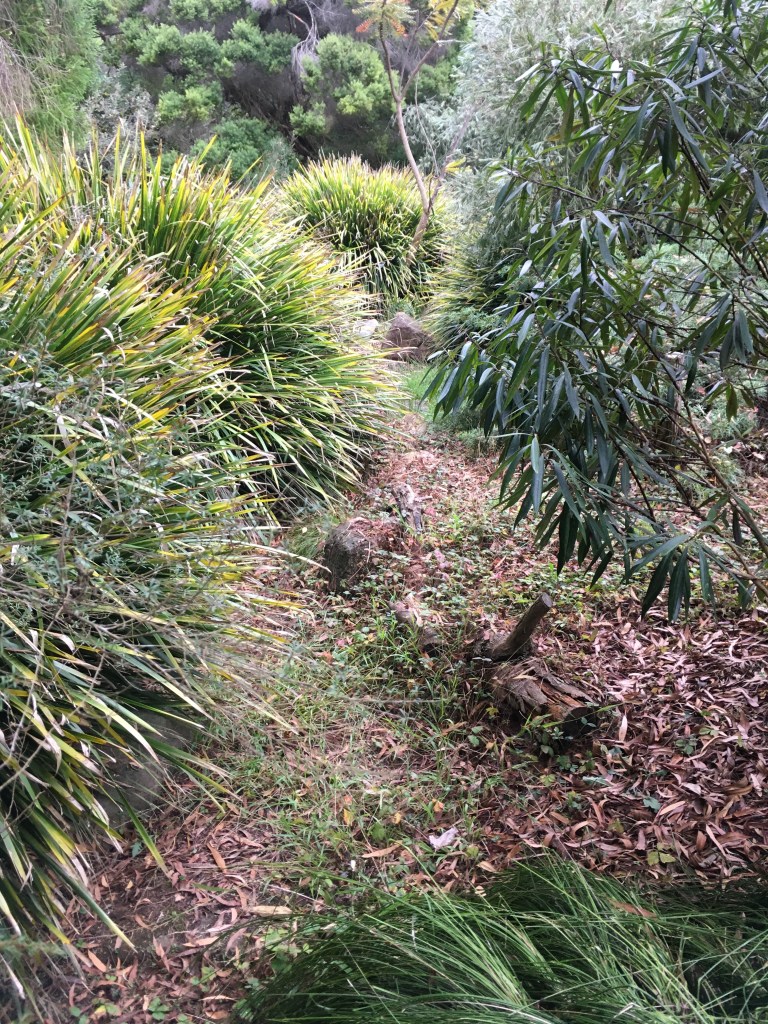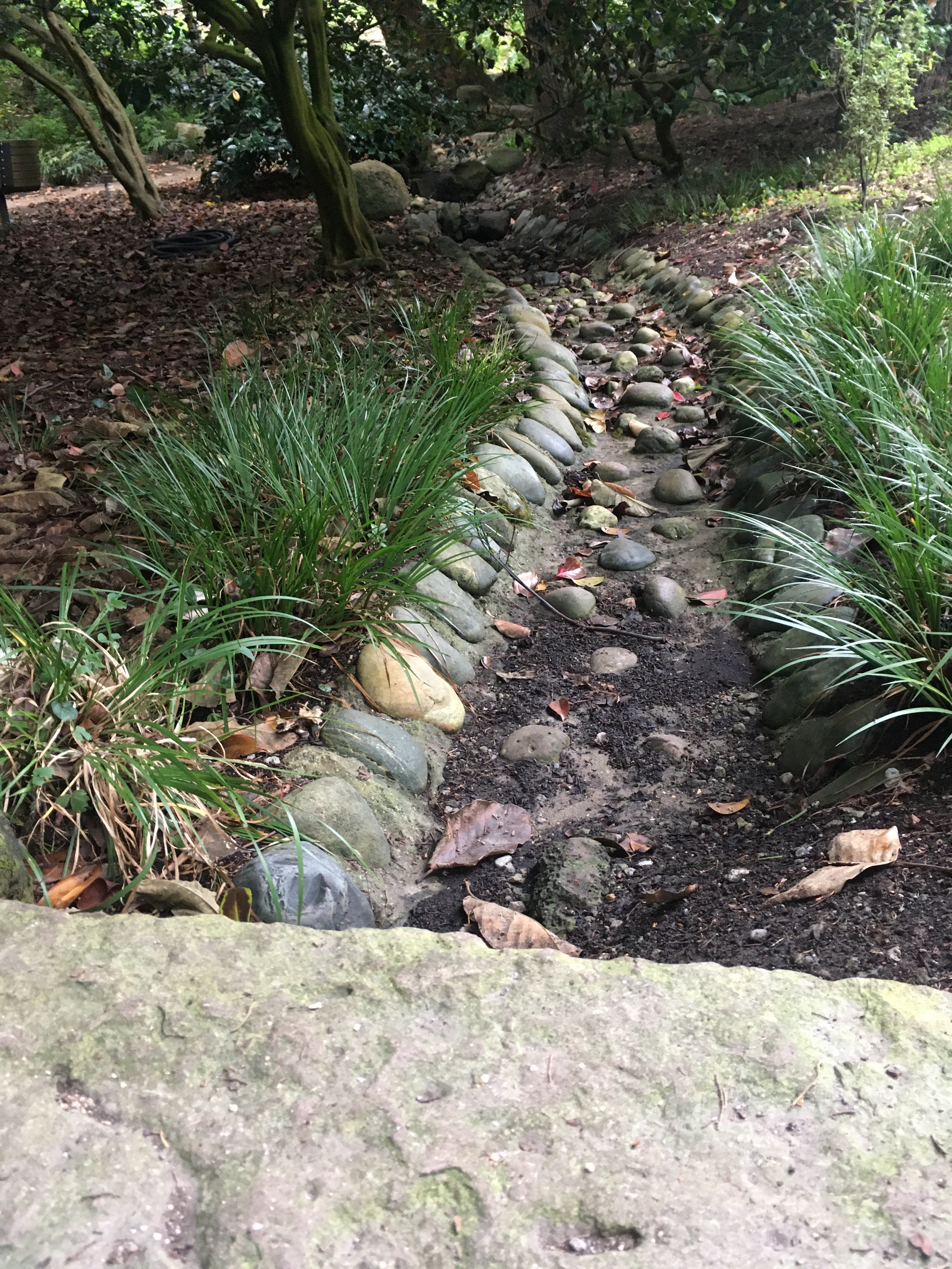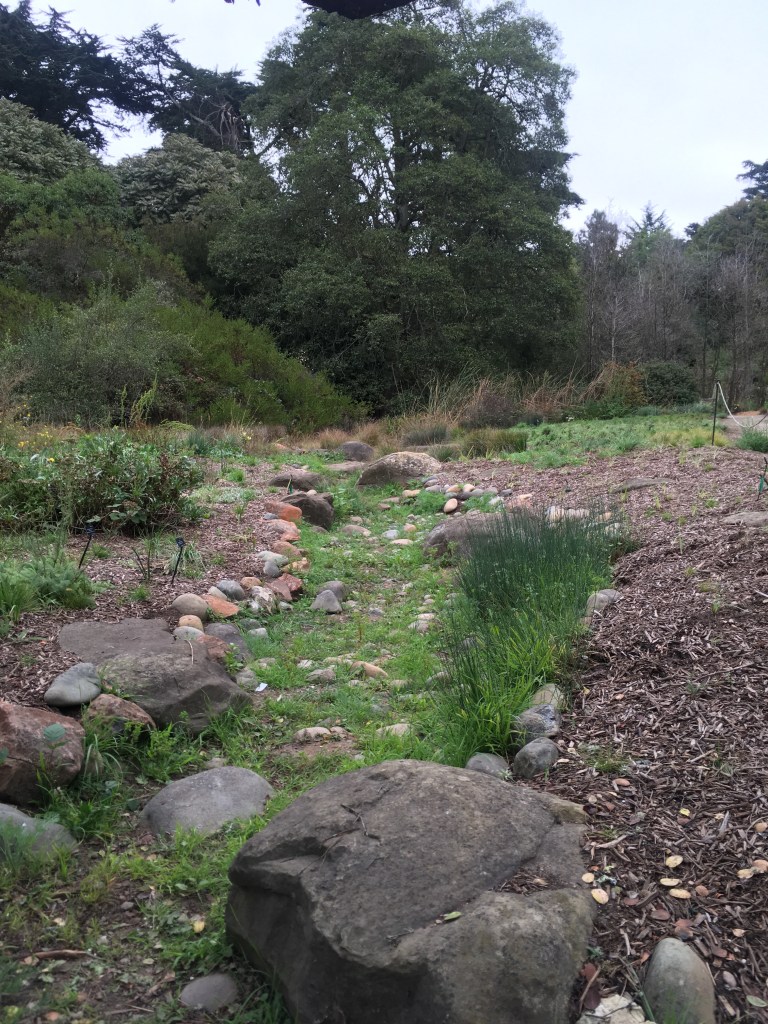 The Australia garden next to the Primitive Garden has a water feature that runs down the middle of it. It is a dry creek bed. This first picture is the end of the dry creek. Over the past ten or fifteen years, all the plants have grown up around this design feature, to the point that it is almost completely obscured by erosion and leafy debris and tall shrubs. But it is still there, the defining cohesive element of the whole design.