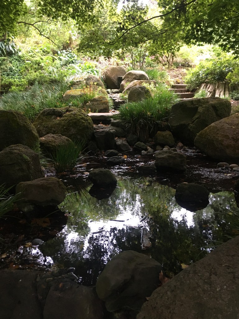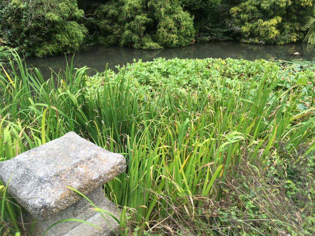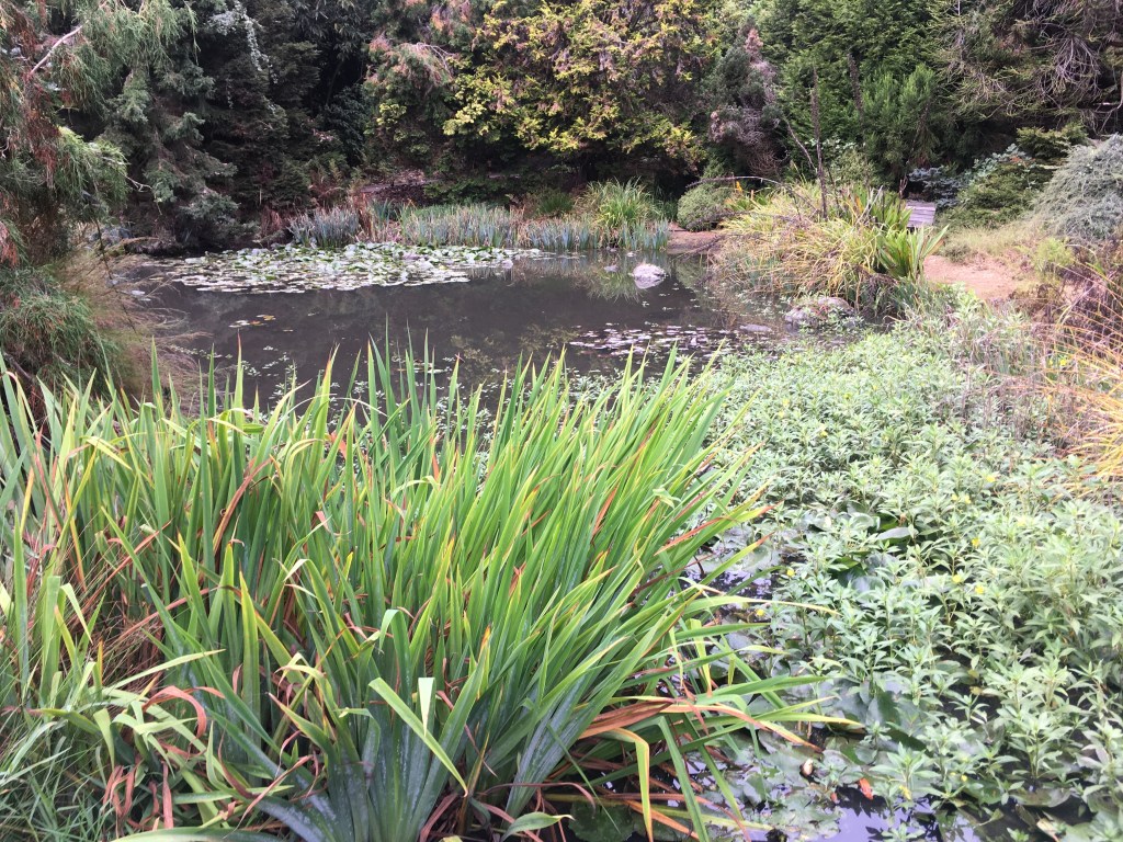 The deck and view of the pond was closed for a wedding. So sorry – could not get in to show you the sights. The pond there is shallow, and there are no fish in it. It is a raccoon hunting ground. What is a neat feature there is a small island in the pond that is in the shape of a turtle. And the overhanging Coriaria tree is quite a specimen too.