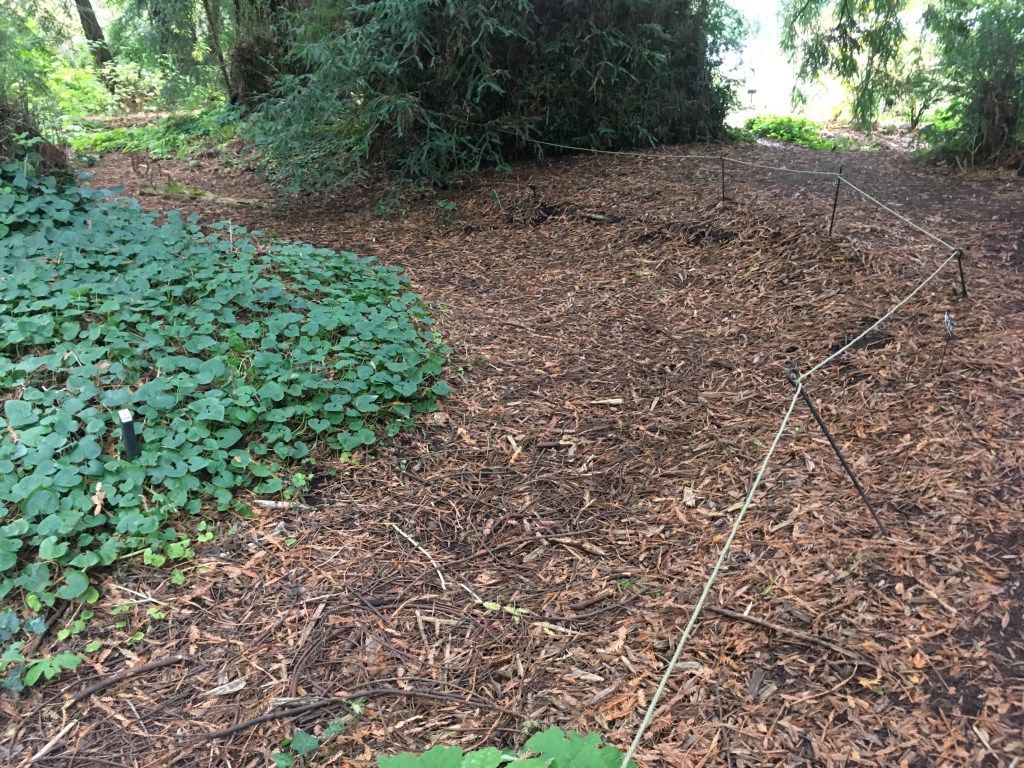 The main body of the California native plant garden is in the shape of a large oval, with a small pond and a bridge at the head of it, and a dry creek that runs through the garden. (This is a common motif, no?). Here we are looking from the end, or the base of the garden, up at the head. The asphalt road that cuts across it is a new addition – meant for easier access for supplies to the to-be-built new nursery. At the end of the dry creek is a tiny tule and cattail lined pond and an Alder tree, which is commonly found close to water in nature.