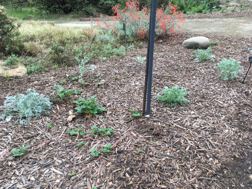 Alongside the new road are new plantings. On the far side are woody shrubs – sticky monkey flower, toyon, coyote bush, coffee berry. The dominant shrubs of the coastal sage scrub. On the side closer to the rest of the garden are low plants more commonly found on the beaches and sand dunes – beach sage and beach strawberry, plus some coyote mint of the clay rocky uplands too.