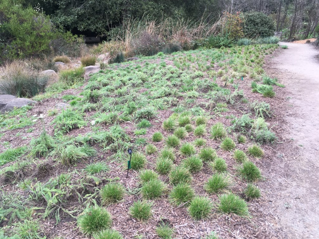 The bunchgrass meadow has been painstakingly planted. Heres Purple needle grass Nasella pulchra, tufted hairgrass Deschampsia cespitosa, and California oat grass Danthonia californica. You can still find these plants occurring naturally in San Francisco. Nasella and Danthonia form small stands at McLaren Park in the grasslands by Gleneagles Golf Course. They are periodically burned around the Fourth of July. The only place you will find wild tufted hairgrass in San Francisco is on Bayview Hill by Candlestick. It is in a few patches where it is wet and close to the groundwater seeps near the top of the hill. It is scattered and does not form dense masses.