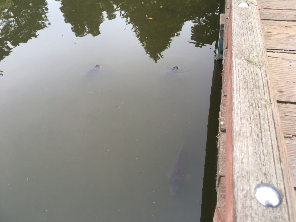 Big ol carp always come by for a hand out at the pond. They are not the fancy pretty koi, they are all gray brown colored. But they are the same fish – a chunky scaly fish with barbels around the mouth that thrives in freshwater that has low oxygen content. It likes a similar habitat as catfish. In many parts of the country the carp is considered an invasive species.