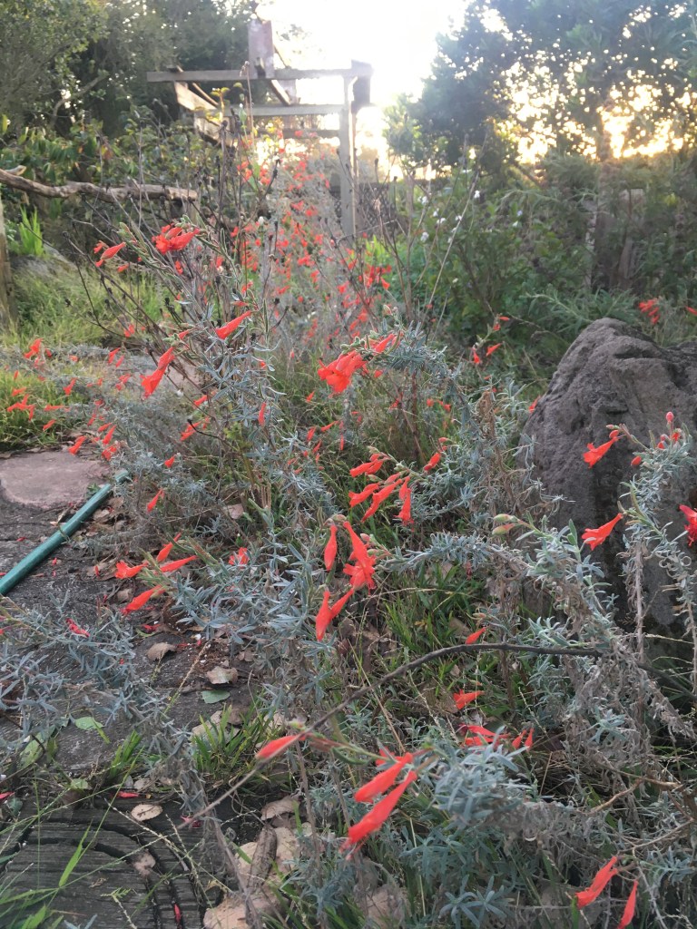 California fuchsia in the cloud garden, small tree in backdrop is wax myrtle Myrica californica:
