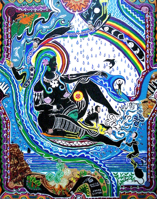 Usually this chapter, I show this painting I made called our Lady of Black’s Beach and tell the story of how Maui was cracked in half by Hine-Nui-Te-Po when he tried to swim up her birth canal. Then go into detail about Dave the Tank marginalies or Bruce the Barbinskate, Jack the lego maniac and Bob the seal who lives with Corona the dog in a shack at Rosarito Mexico by the power plant and taco stands and ship wreck in the line up. That painting is about the landscape called the mother ocean. But I have already told a few surf stories and try not to be repetitious.