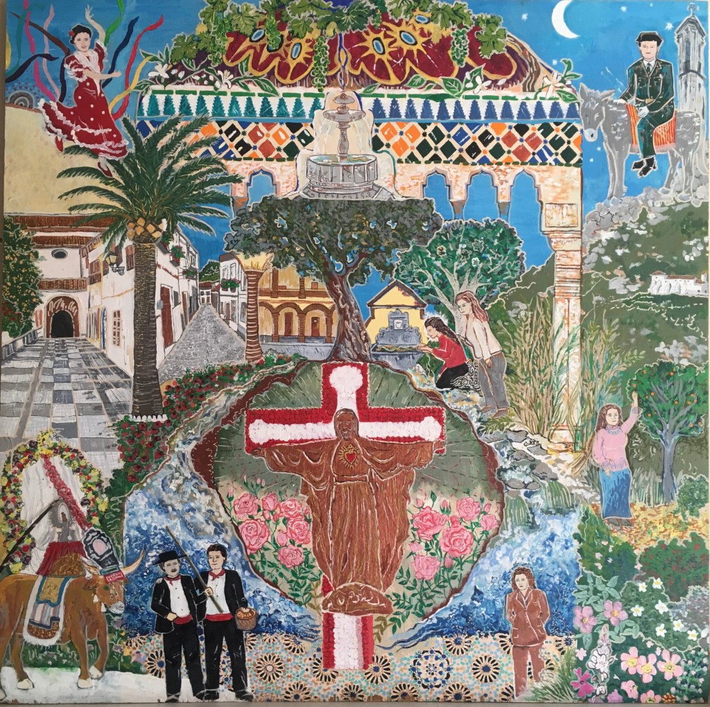 Later, in may, is the romeria. That is when the whole town dresses up fancy and walks the two three miles outside of town to greet and receive the tiny little virgin statue hidden in a cave, found by the farmer and shepherds. That is why you see the bull dressed up in his best gear and the two brothers too, Antonio and Pepe. They are there to prod the bull along and do their work as the mamporero. My wife has three older sisters, they are there too. One is a politician activist name Ana, another is a botanist poet named Aurora, and the last is a great mom and grandma and baby sitter and cook and all around busy body named Isabel. Mom Maria is in the upper left, doing her flamenco thing with the tamborine sun, and dad Sebastian is on the right with the arching moorish moon, he is guardia civil and marine. But I mounted him on a donkey since I really like donkeys and isnt that how jesus went into jerusalem?