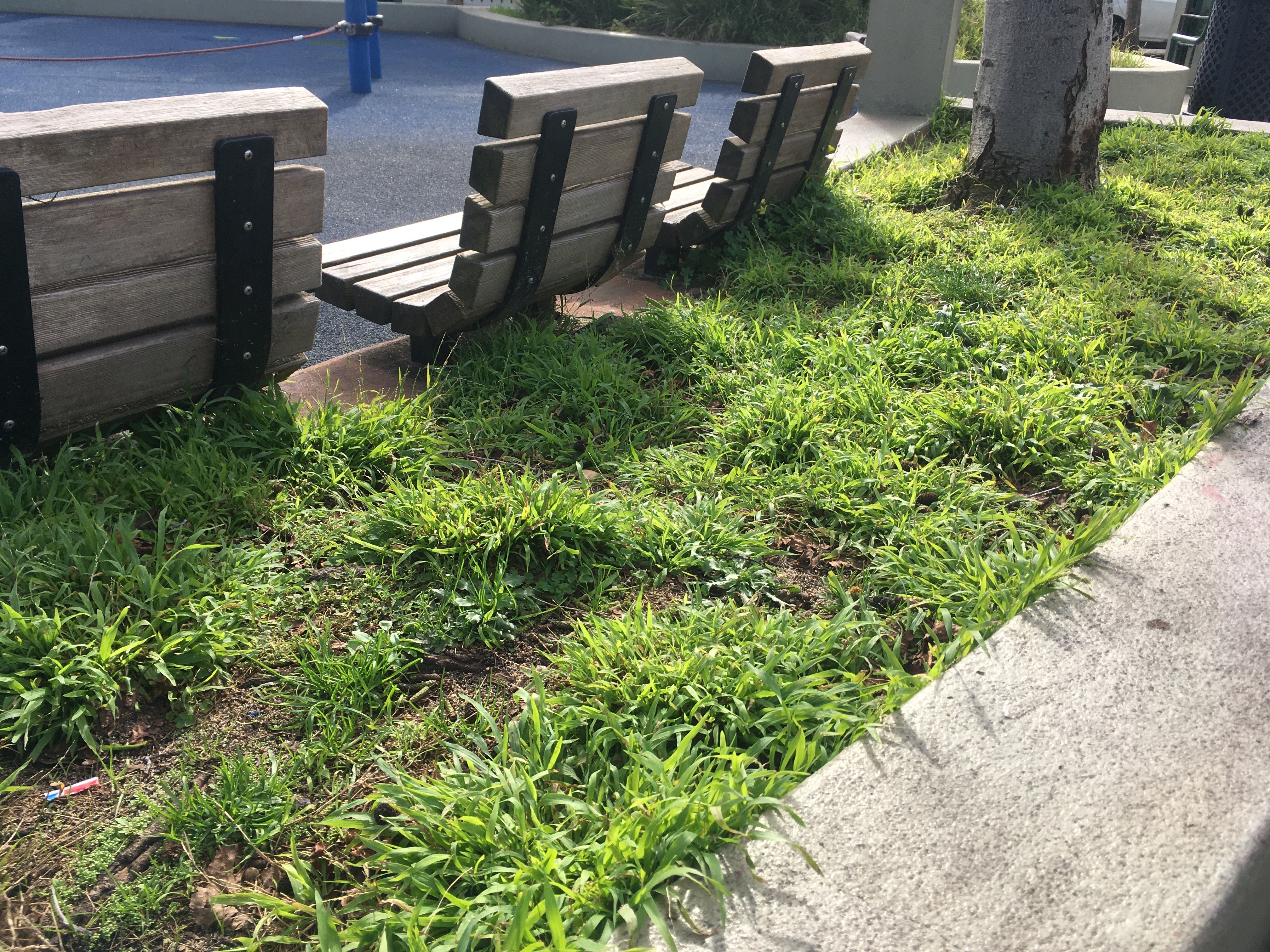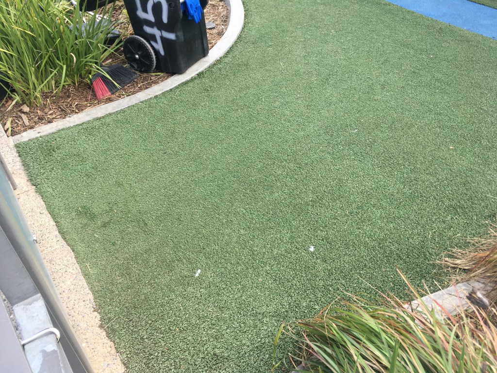 At the childrens playground on the plaza, there was kids playing on the artificial turf. It still requires maintenance, just not the mowing and watering variety: