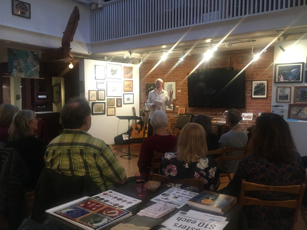 Friend and San Bruno Mountain guide David Schooley had an art show pow wow in downtown San Francisco by North Beach, Chinatown and the Transamerica Pyramid. I don’t get out to that part of town much, especially at night – there’s a lotta neat history tucked in them alleyways and beneath the colossal high rises. Plus its always fun to meet new friends, share tales, eat snack food for dinner, and chat about the challenges in land conservation.