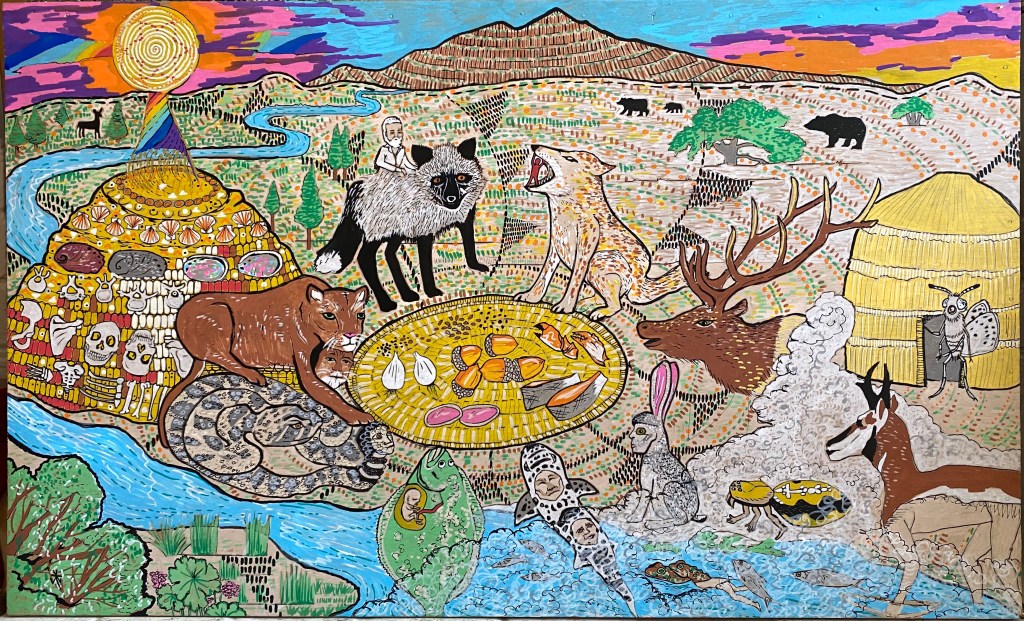 At the art show, after the speakers had finished, people were sharing and blabbing about antelope and fog. Those are two of my most favorite creatures! Then I went home and painted a goofy mythic picture. Here is the explanation for the painting presented above – for people who are more analytical in nature, and like everything laid out in a logical fashion, not ?? nut ball weird artsy fartsy style. LOL.