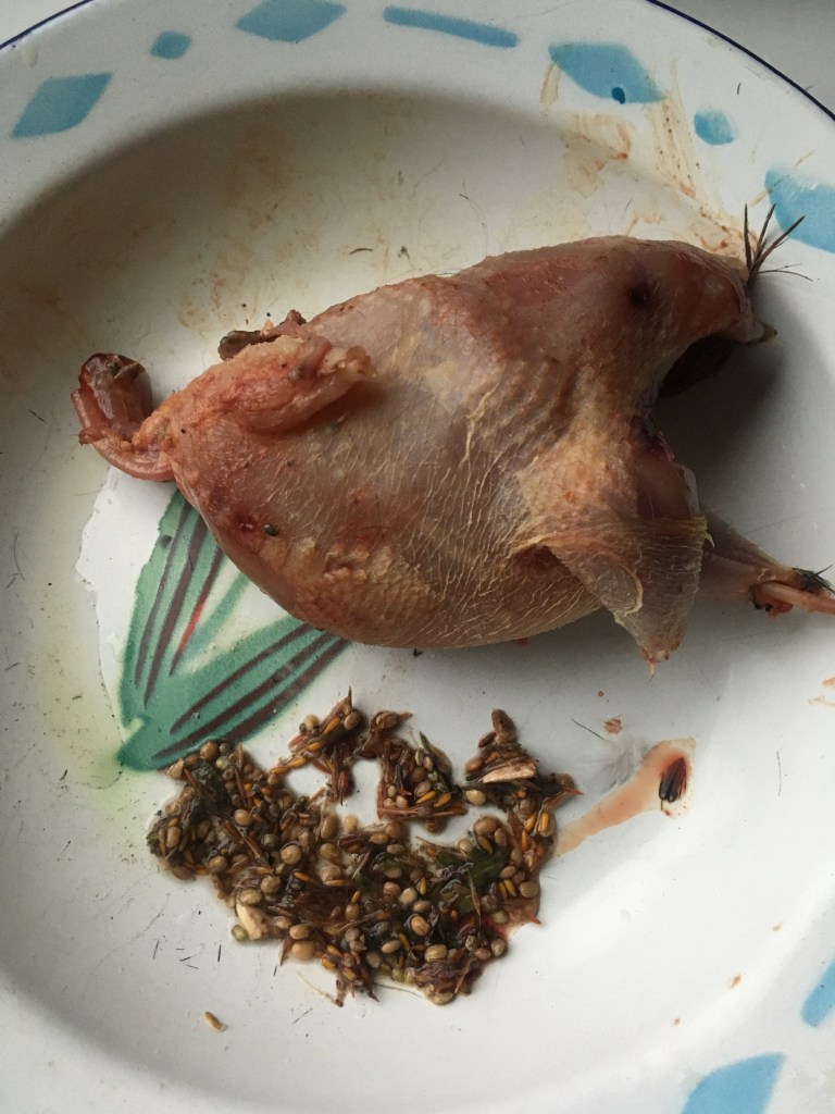 Like always, I was curious about what they had been eating. This way, you know where to look for em next time. It is the same with hunting mushrooms – what trees is it growing next to? It is the same with lingcod – what is in its stomach? Octopus?! Again?! The chunky, muscle bound, buff tough little bird is the California quail. The skinnier smaller one is the dove, a white winged dove to be precise.