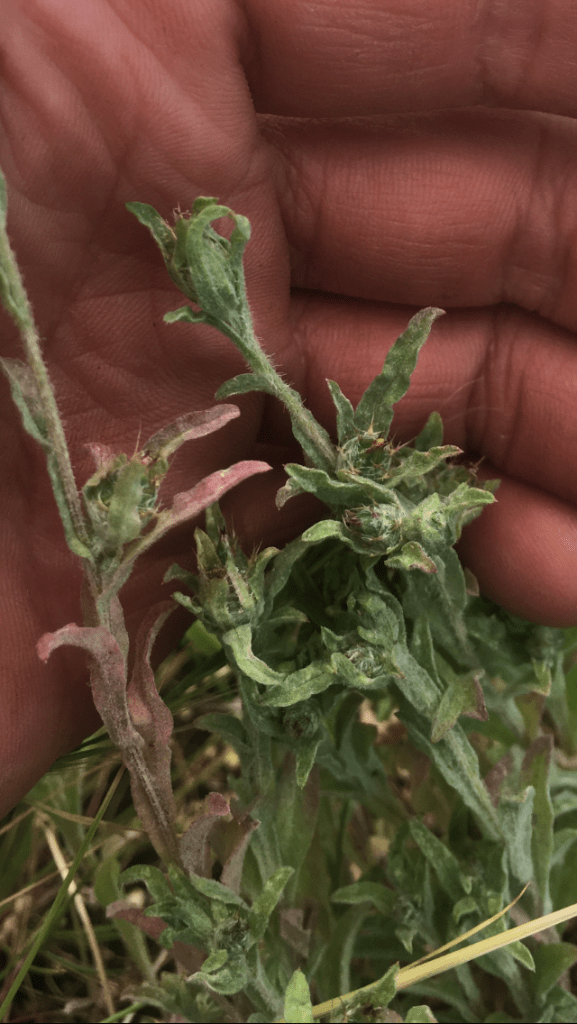 On the dove side, seeds came up quick. The leaves look comp-ish like a dandelion or a thistle or something. Wait for it. Wait for it. The flowers – bit of a tinge of purple spines and yellowish flowers. Internet ID taxonomy seems to point towards the Maltese star thistle Centaurea melitensis. Okay, we got one!