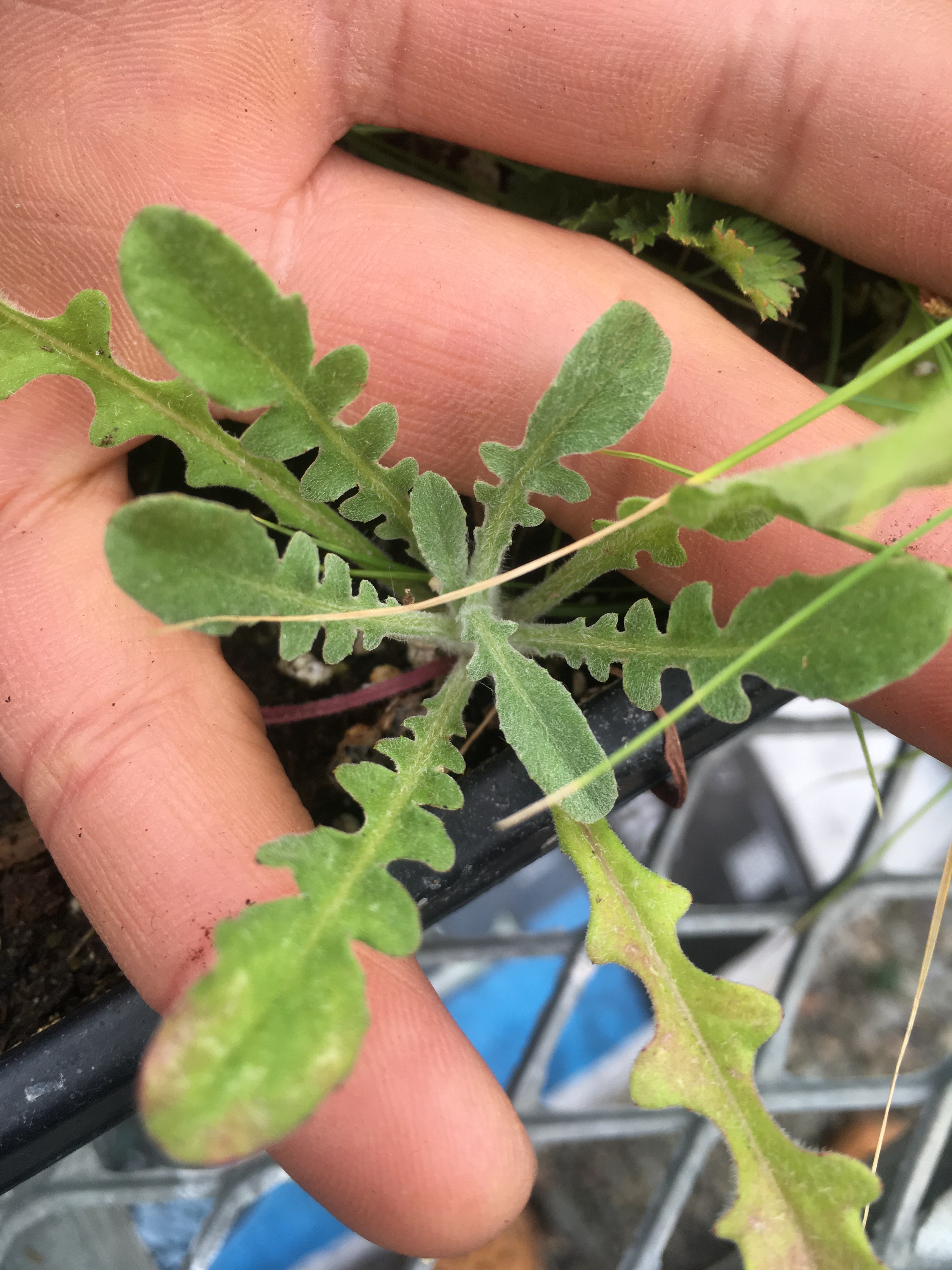 On the dove side, seeds came up quick. The leaves look comp-ish like a dandelion or a thistle or something. Wait for it. Wait for it. The flowers – bit of a tinge of purple spines and yellowish flowers. Internet ID taxonomy seems to point towards the Maltese star thistle Centaurea melitensis. Okay, we got one!