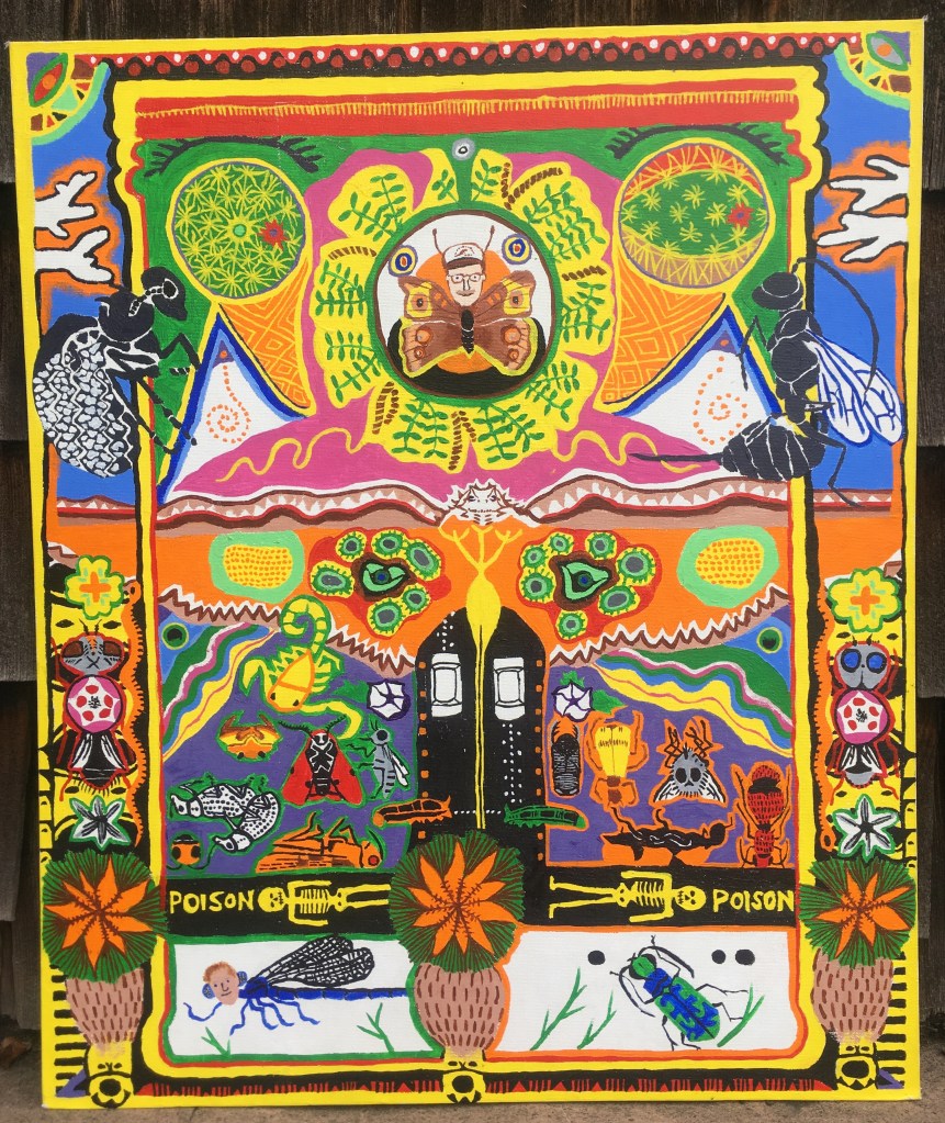This painting was inspired by our entomology class field trip to a desert research station located in the Mojave desert at Zzyzx, about a hundred miles south of Las Vegas. It is dedicated to my teacher and advisor Dr John Hafernik of San Francisco State University. He is depicted as a buckeye butterfly wearing a baseball cap, surrounded by screw bean mesquite. My fellow graduate student is at the lower left, Dr Gene Hannon (aka Gene the dancing machine) who studied damselflies.