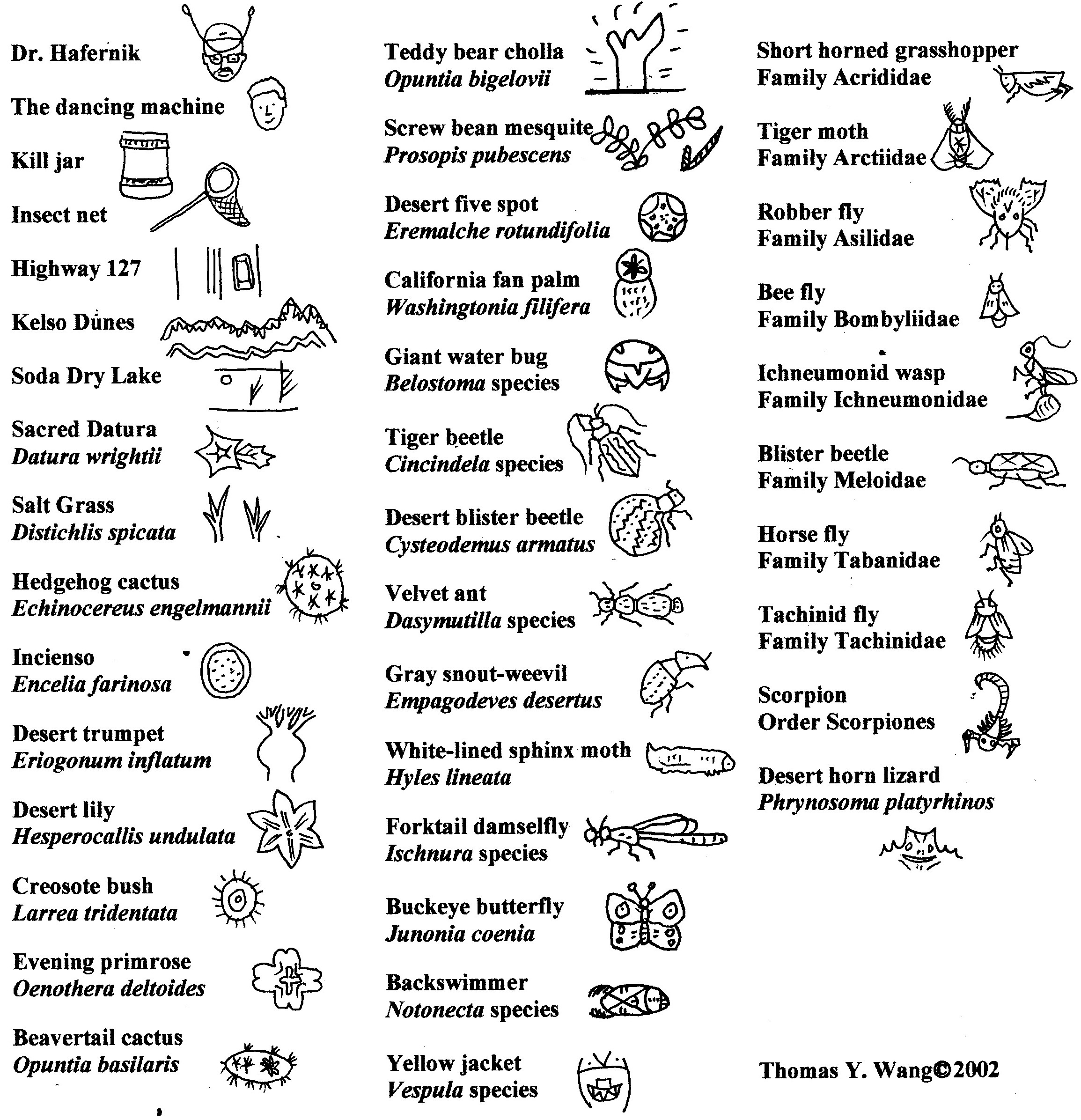 This painting was inspired by our entomology class field trip to a desert research station located in the Mojave desert at Zzyzx, about a hundred miles south of Las Vegas. It is dedicated to my teacher and advisor Dr John Hafernik of San Francisco State University. He is depicted as a buckeye butterfly wearing a baseball cap, surrounded by screw bean mesquite. My fellow graduate student is at the lower left, Dr Gene Hannon (aka Gene the dancing machine) who studied damselflies.