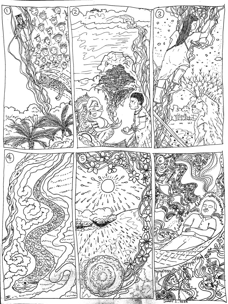 still laughing about tales of good and evil, and the river vines full of colors