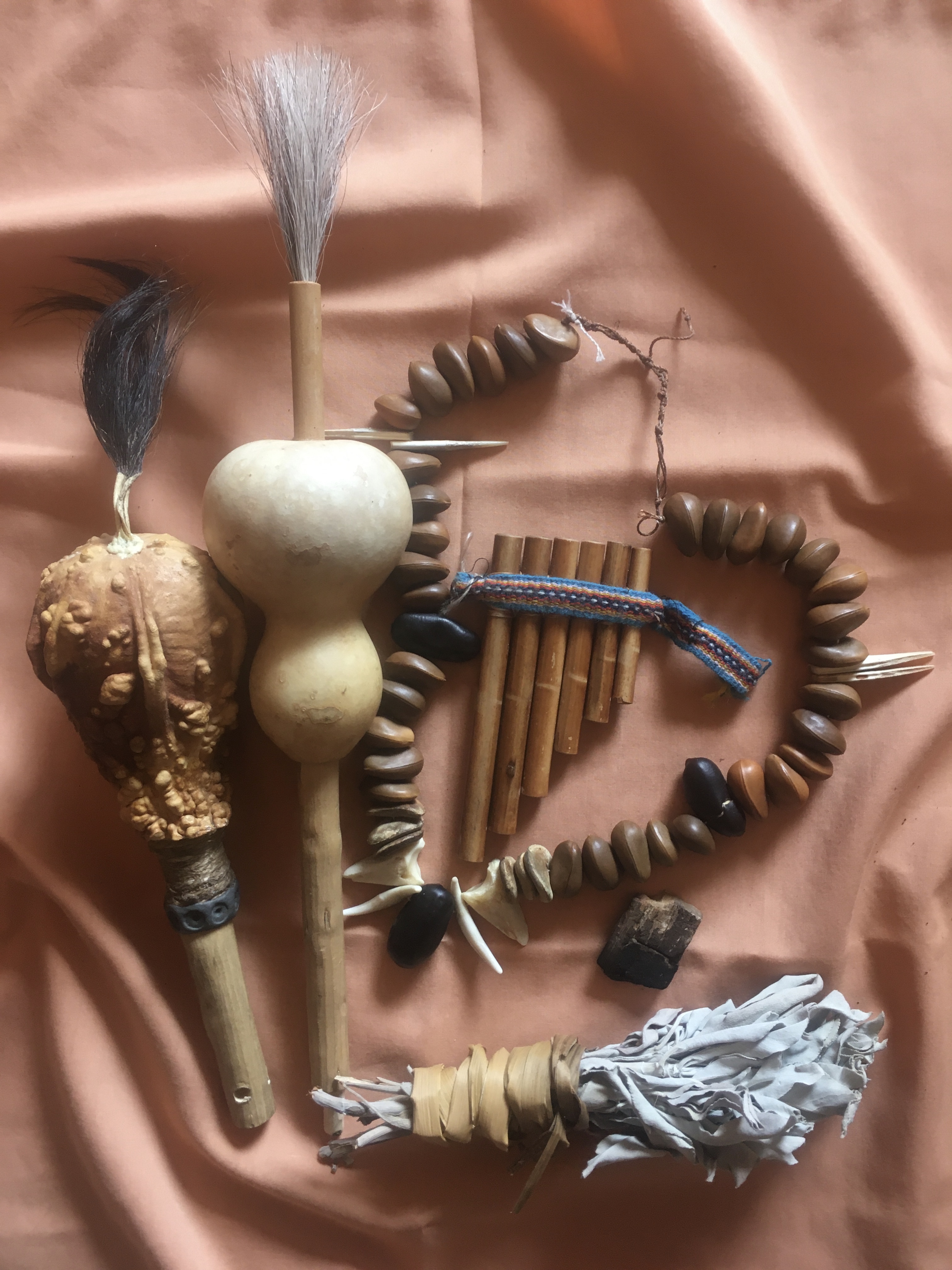 Next best would be a quiet back yard or living room space that you are familiar with. Just let people know what you are up to, so the kids don’t suddenly barge in with five of their friends and start cooking in the kitchen, the Amazon delivery doesn’t keeps ringing the bell, and your partner does not call you for a ride cause their car broke down, and other such ongoing interruptions. If you are indoors, try to shut down the modern stimuli and stage the primal ambiance. By that I mean no TV phone computer blah, and yes to sweet scents like frankincense and myrrh, palo santo and copal. Have a lighter ready for those resins. They help to scent and ‘clear the air’. When staging try to mimic a calm, beautiful garden of sorts. A little music is nice, again ideally a person (you?) is playing rattles and clapper sticks, or hollow wood and goat hide drum skins. The music keeps the energy flowing and in motion. See below for accompaniment and reasoning.