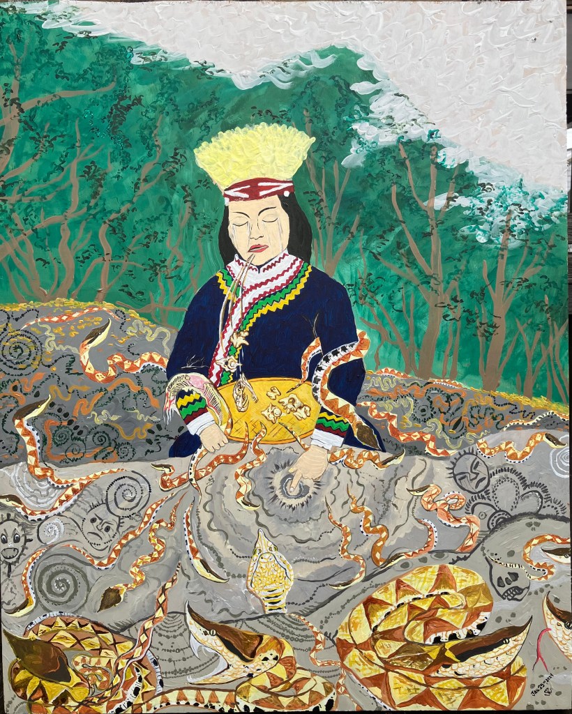 Well on the island of Taiwan aka Formosa, before the coming of the Portuguese, Dutch, Japanese and Chinese peoples, there lived and continue to live a number of indigenous aboriginal southeast asian malay polynesian tribal peoples. In one of their stories, a Bunun tribe woman named Hossu married a man named Li Ta Ko from the Rukai tribe. They were happy for a while, but things did not work out. Basically it came down to this: she liked to eat snakes – specifically, Chinese moccasins – and the in laws did not. Hossu left the Rukai, and ended up alone in the misty mountains. She kept waiting for a husband who did not come for her. In sadness, anger, and bitterness, she etched the rocks with her fingertip, and kept eating snake meat. And when she spat out the bones, they would turn into more snakes! The land was filled with pit vipers. This rock where she sat and traversed is called the great carved rock of Oponohu, and it is in the Maolin district of Kaohsiung County, in the southwestern mountains of the island.