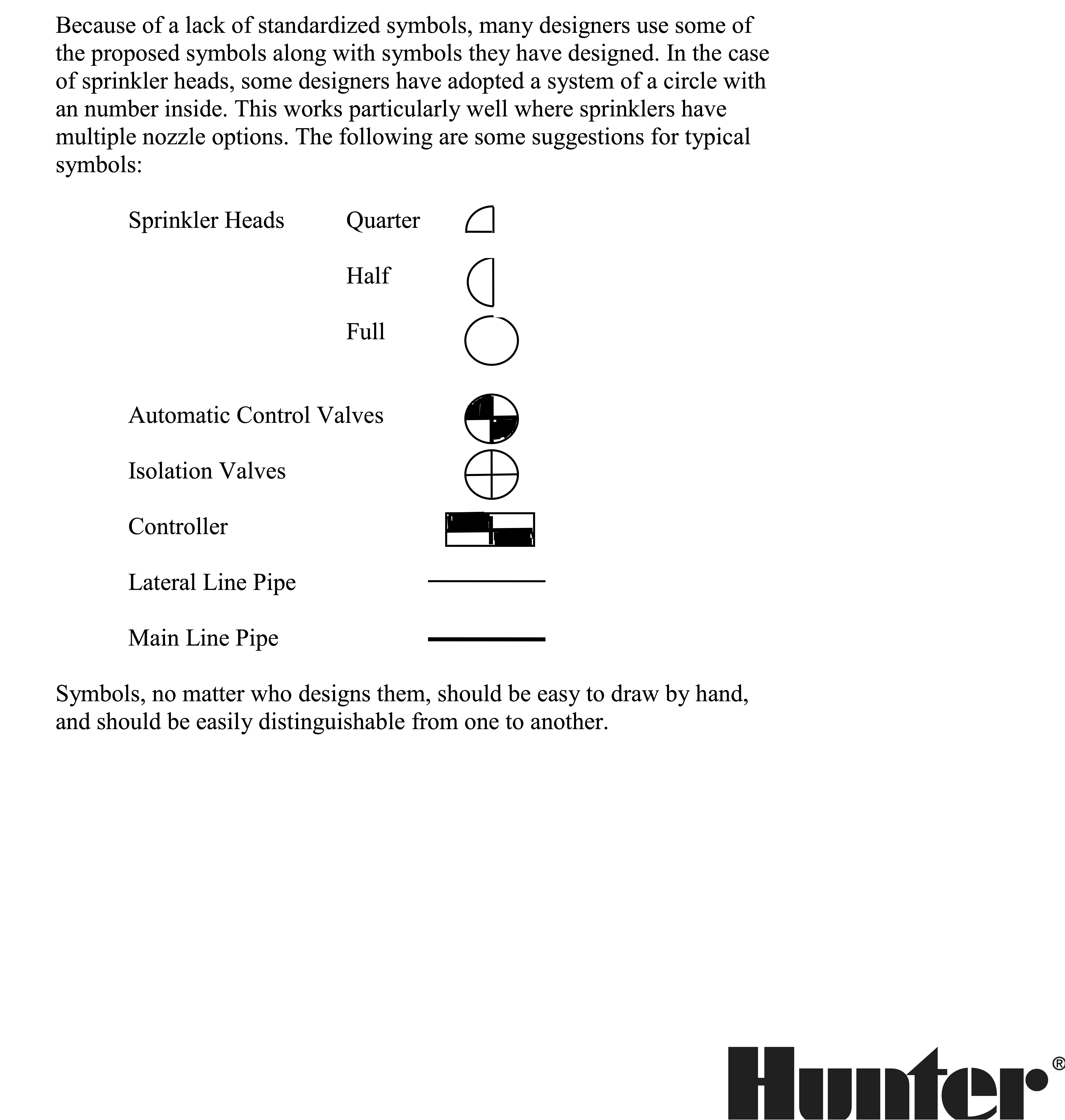 The American Society of Irrigation Consultants (ASIC) and the American Society of Agricultural Engineers (ASAE) have both proposed standardized symbols for landscape irrigation. The irrigation industry, however, has been reluctant to accept any set of standard symbols for irrigation design.