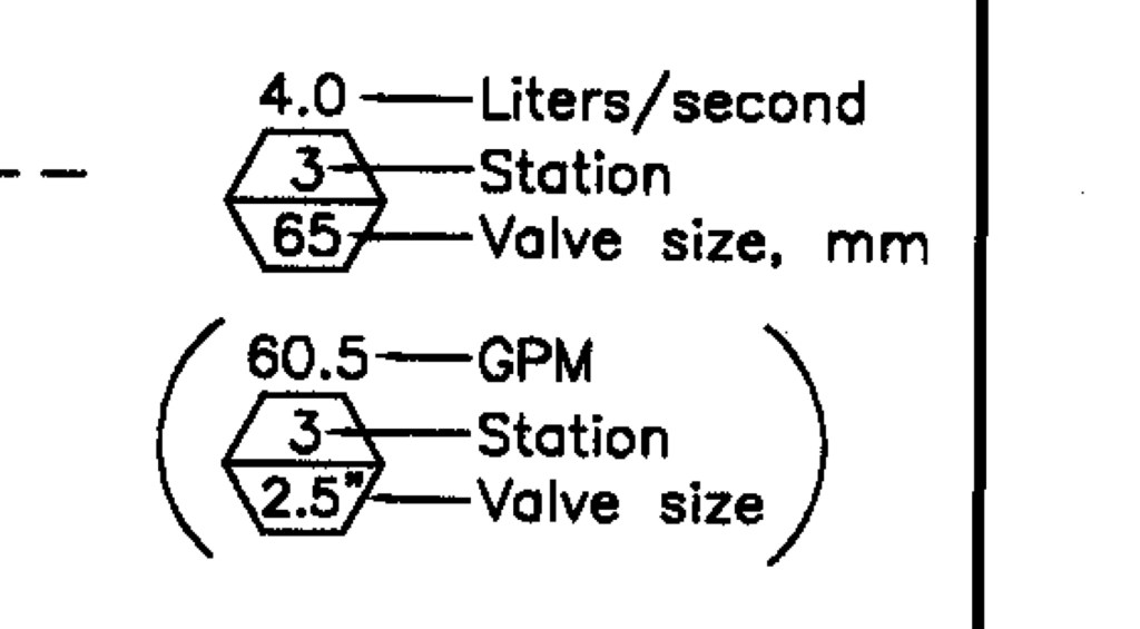 One of the most important symbols/information source is contained in this six sided hexagon (sometimes it is a rectangle or a circle too; remember that the plans are not standardized). At the least it tells you what Station or Zone it serves, how much water is flowing past it measured in GPM Gallons Per Minute (kinda tells you theres x number of sprinklers on this line sucking oh so many gallons per minute), and the size of the Valve which as you know would determine how much water can flow past in that pipe. Pipes in most smaller applications like homes and landscapes come in the 1”, 3/4”, and 1/2” sizes. Gets head scratching too when they start writing metric mm or liters measurements instead of inches and gallons and dont write the notations.