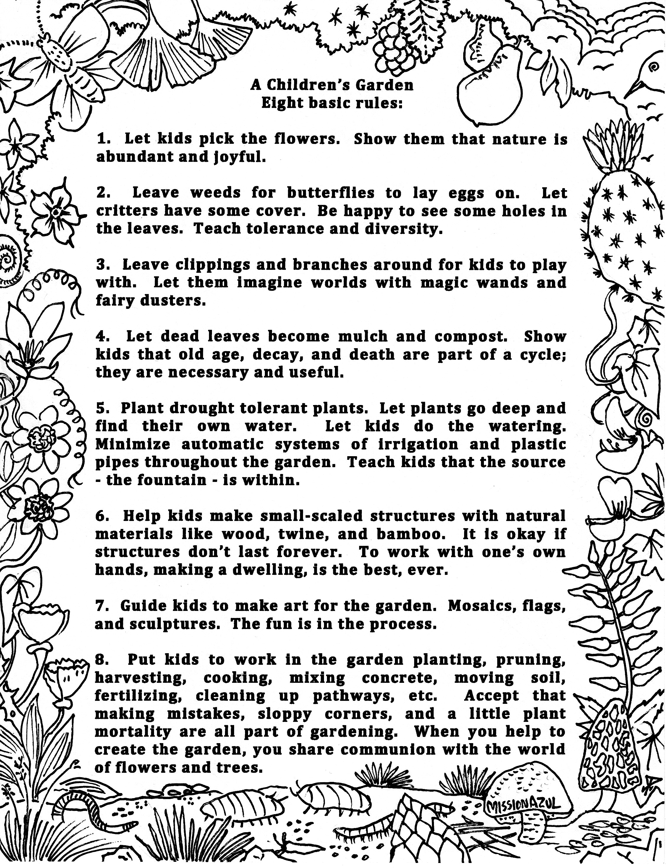 Rule 8: Put kids to work in the garden planting, pruning, harvesting, cooking, mixing concrete, moving soil, fertilizing, cleaning up pathways, etc. Accept that making mistakes, sloppy corners, and a little plant mortality are all part of gardening. When you help to create the garden, you share communion with the world of flowers and trees.